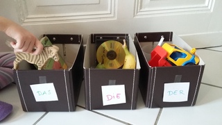 Kinder sortieren reale Gegenstände in Kisten, um so z.B. Artikel oder Farben zu lernen
